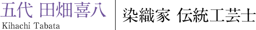 - 昭和10年生まれ、昭和34年早大第一文学部美術専修卒業、昭和36年京都市美術大学日本画科終了。祖父(三代喜八)・人間国宝、父(四代喜八)に師事し染色全般を修得。染織家。伝統工芸士。五代田畑喜八。